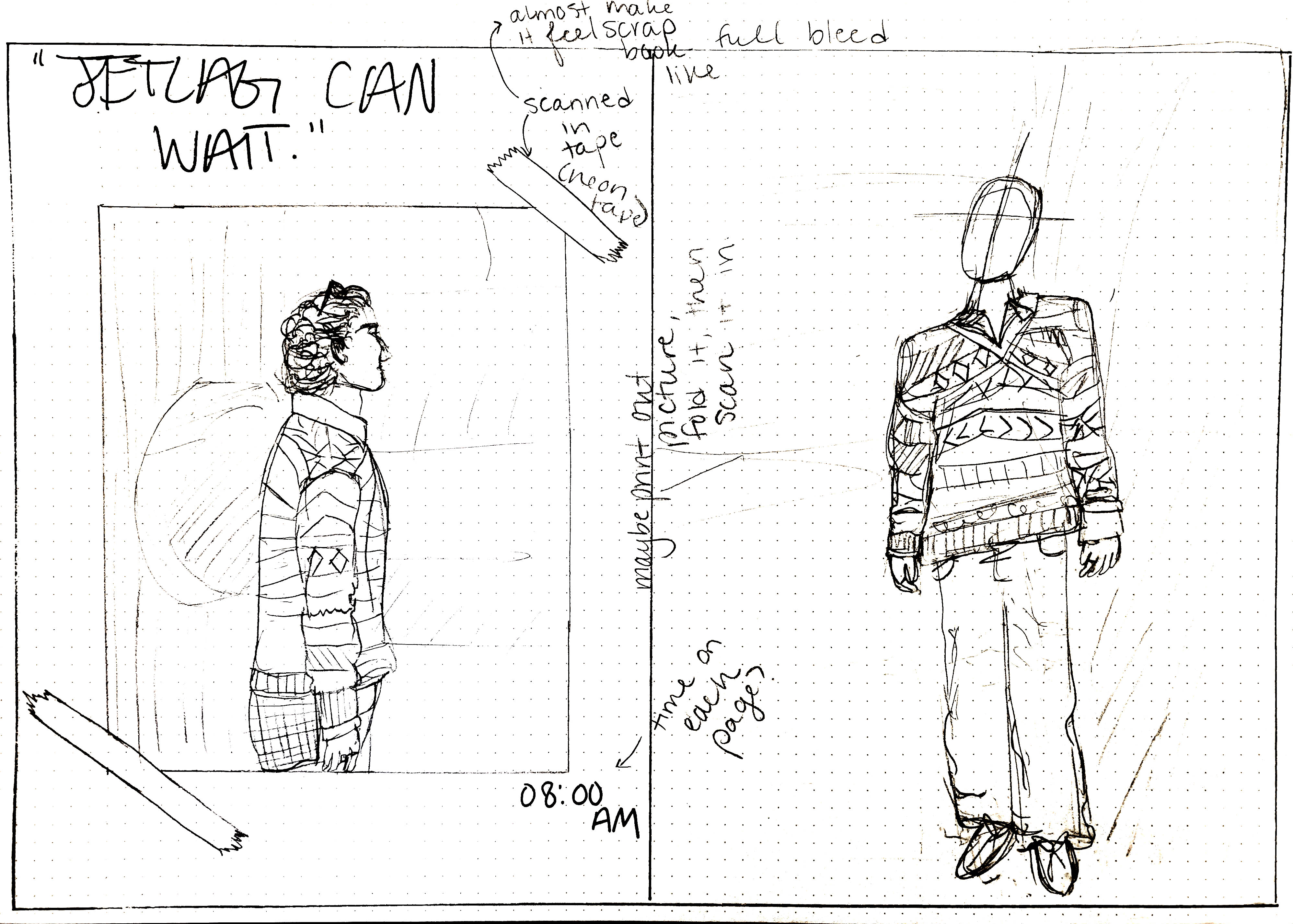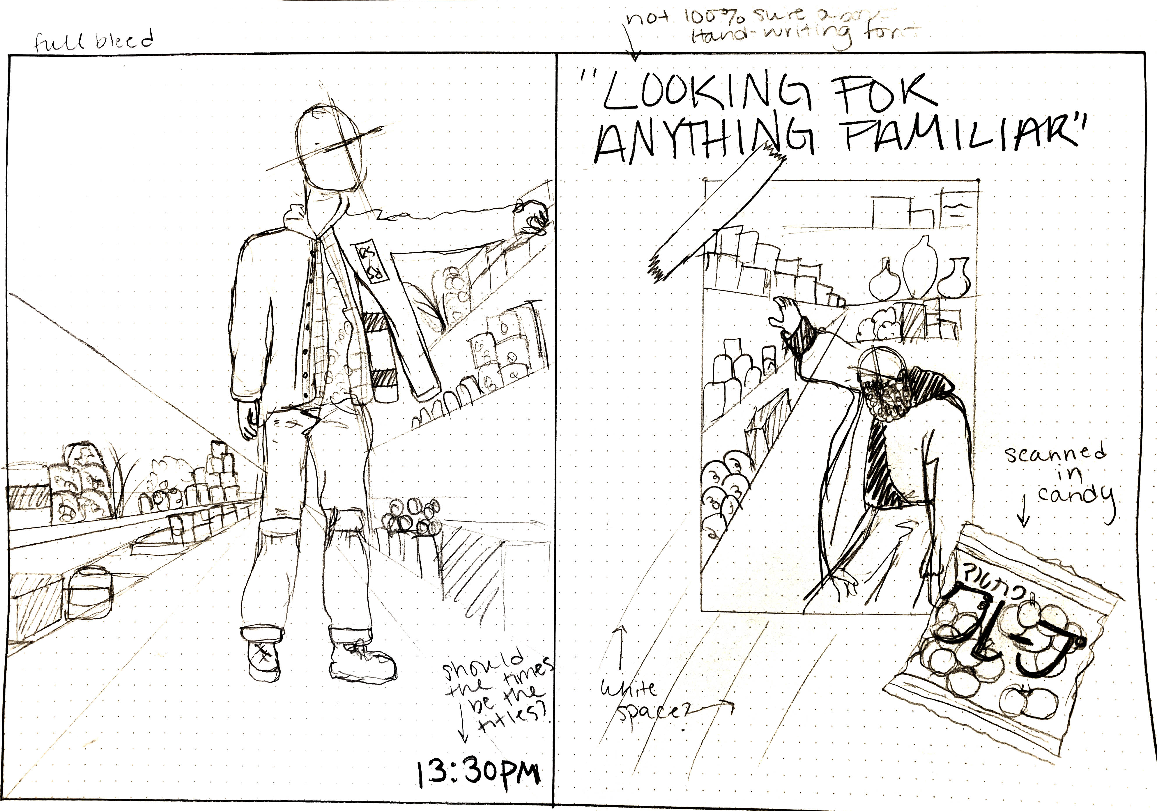 Sketching the layout of the magazine helped alot with solidifying which details I wanted to include in the magazine. These include, the colored tape, the Japanese candies (on the back cover), and the time stamps on each of the different spreads. Drafting how I wanted to include these different elements made my approach more organized, and gave me a specific goal. Additionally, these sketches helped me understand that the photography should be the focal point of the magazine; rather than type or the scanned in elements.